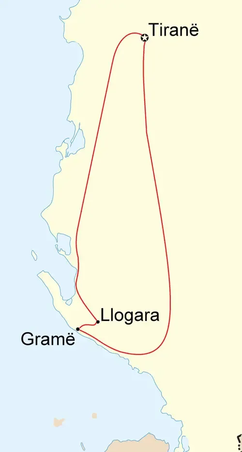 Today’s hike takes us along a beautiful trail running parallel to the sea, with mostly gentle and flat terrain. A bathing break is possible at St. Andre Bay, a secluded and untouched spot, for a short swim or relaxation. We will continue toward Palasë, home to a striking white delta formed by limestone sediments from the “stream of white roads.” The hike ends in Palasë, where a vehicle will be waiting for you. The final leg of the journey takes us to Tirana, saying goodbye to the beautiful coastal landscapes.