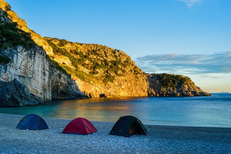 The day begins with the hike to Grama Bay, starting from the hotel and winding through a lush forest toward Qafa e Thellë, the boundary between the Llogara and Karaburun National Parks. The trail continues over rocky paths to the Grama bay, a serene haven of crystal-clear waters and untouched beauty. Grama Bay is steeped in history, featuring carved frescoes from the early Christian period and inscriptions from the Hellenistic era. Enjoy the tranquil surroundings before settling into tent accommodations for the night.